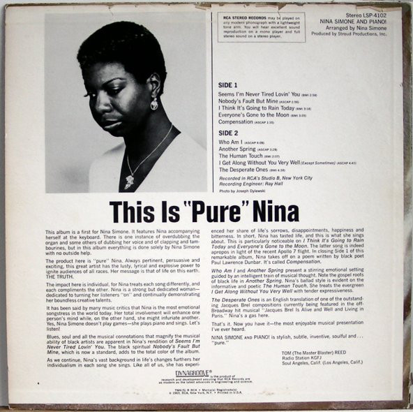 To have come within sight of a possible future and to have come only to this silence of defeat. And in that silence to sit down, without a band, without those musicians of whom she’d say ‘they are an extension of me or they don’t play with me’, to sit down without them, in RCA’s Studio B in New York, alone again naturally. To reach out one hand, and then another, to engage with the keyboard and then, as was now expected, to add voice, to proclaim the words of others and make them her own. It shouldn’t have been surprising but it was. This was something she hadn’t been given a chance to do before, to let out into the world a set of songs delivered by just Nina Simone and piano. No wonder that, in that era of gushing LP liner notes, disc jockey Tom Reed would claim that here, as if for the first time, record buyers could consume ‘pure Nina’.