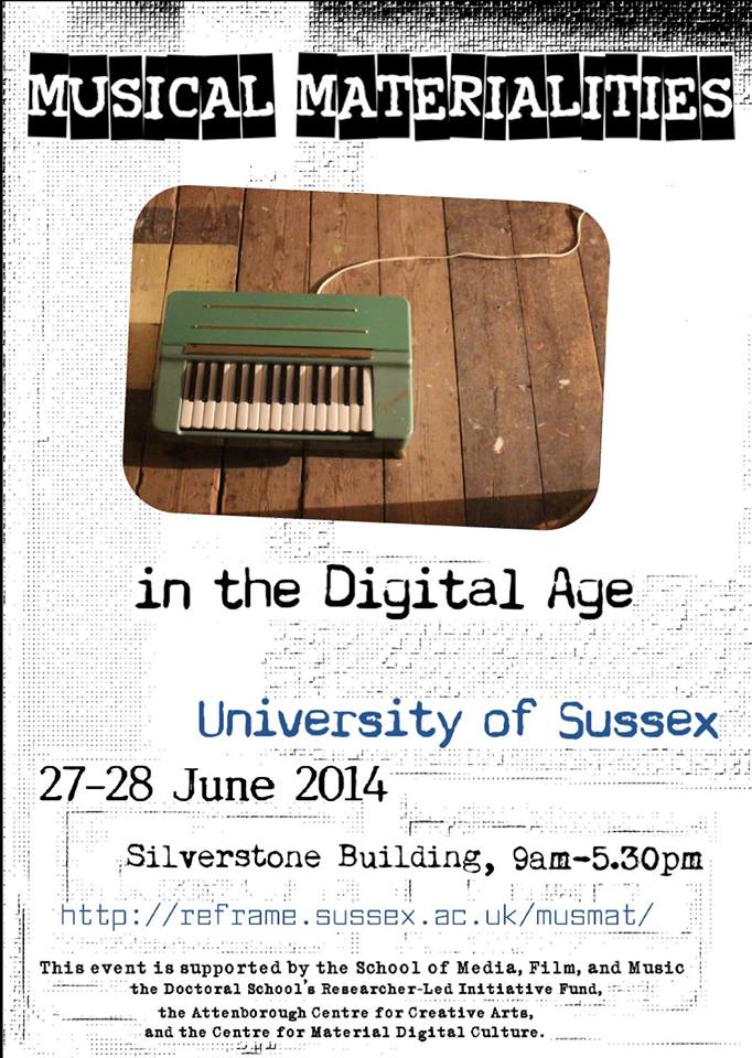 In June 2014, Elodie Roy and I organised a 2-day conference at the University of Sussex University with the title ‘Musical Materialities in the Digital Age’. We wanted to reflect upon the multiple materialities of music objects and technologies, with an emphasis on processes of remediation, residual media, reanimated ‘dead media’, cultural waste, media archaeology (especially manifestations relating to sound and music, e.g. ‘vinyl archaeology’), the recycling of memory and material culture, the digital archive, the future of music creation and consumption, nostalgia and ‘retromania’, music as ‘thing’ and/or ‘process’, commodification and more. The conference website provides more details about the topics we were (and remain) interested in.